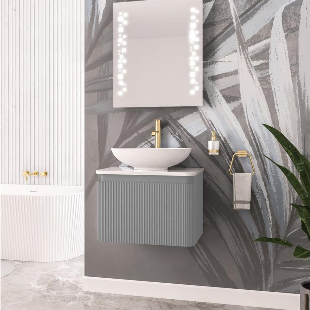 The Belice Fluted 600mm Wall Hung Vanity Unit and White Stone Top Grey combines contemporary design with everyday practicality. The elegant fluted front adds subtle texture and sophistication, while the smooth grey finish offers a modern yet calming presence. The durable white stone top provides a stylish surface for a countertop basin of your choice, allowing complete customisation. The wall hung design enhances space and makes cleaning easier, while soft close doors conceal generous storage for a tidy and organised bathroom.