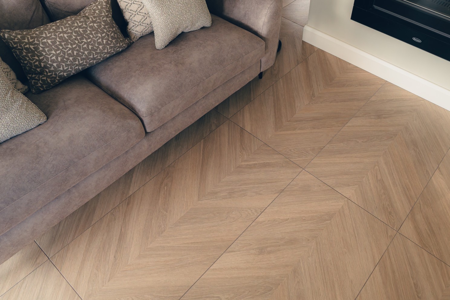 At first glance, it looks like natural timber flooring with its lifelike grain, soft maple tones, and elegant chevron pattern, but it’s actually a high-quality porcelain tile. This means it’s completely waterproof, hard-wearing, and easy to maintain, making it perfect for busy family living.