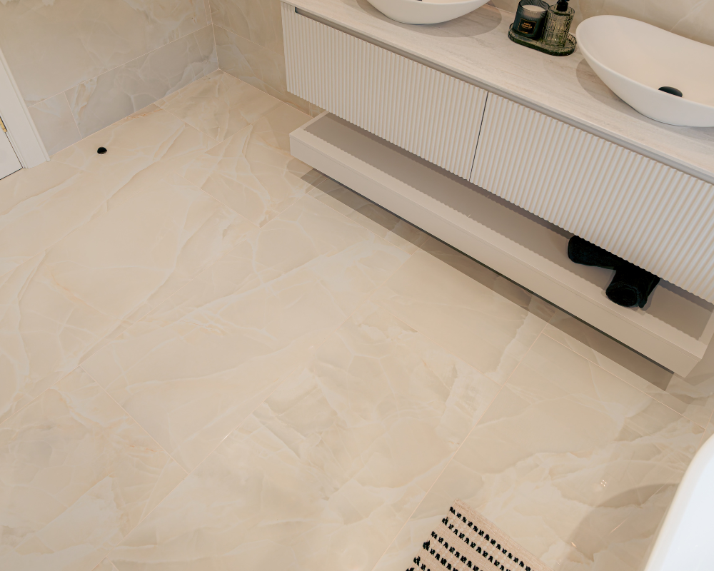We can’t forget about the Viktor Benson Taha 1800 Freestanding Bath. The room was all tied together by the Onyx Sable 60 x 120cm Polished Rectified tile, which made a huge impact on the overall look of the room. We always suggest starting your bathroom design with the tiles, as many people underestimate how much they can influence the overall look and feel of the space.