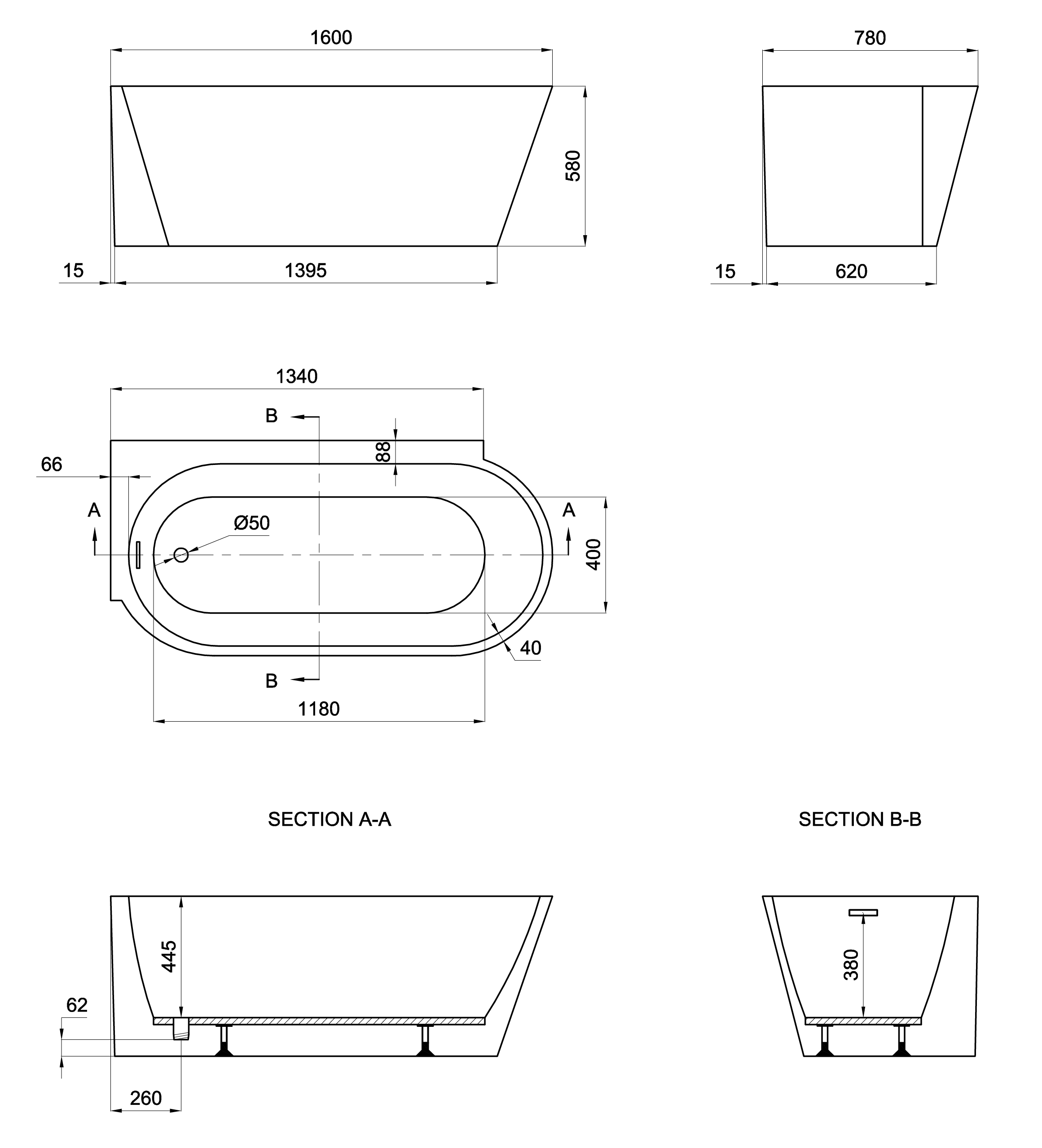 Bray 1600mm Light Hand Bath inc waste Acrylic
