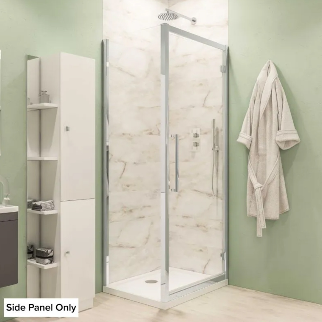 The Corniche Hinge Door Side Panel 2000 x 900mm – Chrome combines quality, strength, and timeless style. Made with 8mm tempered safety glass, it ensures lasting durability and safety. The easy-clean coating keeps maintenance simple, while fully concealed fixings create a sleek, seamless finish. Suitable for power showers, this panel delivers performance and elegance. Pair with a pivot door to create a complete, luxurious shower enclosure backed by a 10-year manufacturer’s guarantee.