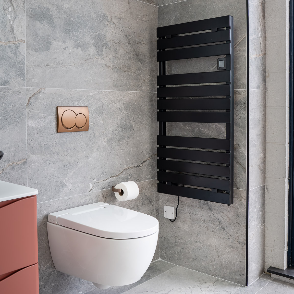 The Reina Gia 1120 × 550 mm Matt Black electric towel radiator adds modern luxury to any bathroom. Crafted from premium aluminium, its sleek vertical frame and matt black finish create a bold statement while offering efficient heat distribution. The compact 1120 mm by 550 mm design projects just 75 mm from the wall, saving space without compromising style. Featuring an intuitive digital control panel, timer settings, and energy-saving modes, it delivers warmth, control, and contemporary elegance.