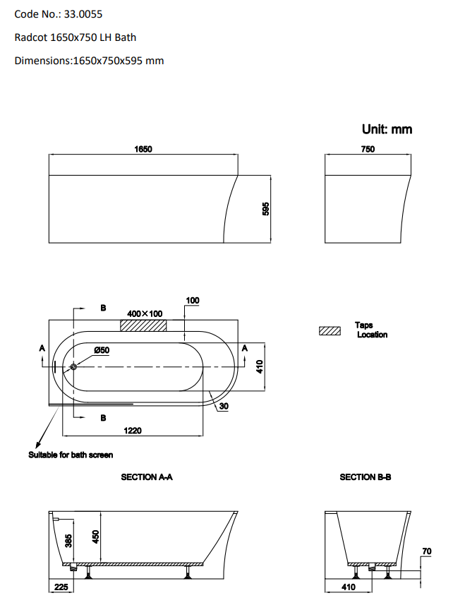 The Radcot 1650 x 750 Left Hand Bath is the perfect fusion of modern elegance and practicality. Designed to fit seamlessly into right-hand configurations, it features a sleek, sculpted shape with a smooth white finish. The extended ledge offers additional space for taps or accessories, while the generous interior ensures a relaxing soak. Crafted from high-quality acrylic, it’s durable, easy to clean, and ideal for contemporary bathrooms seeking understated sophistication.