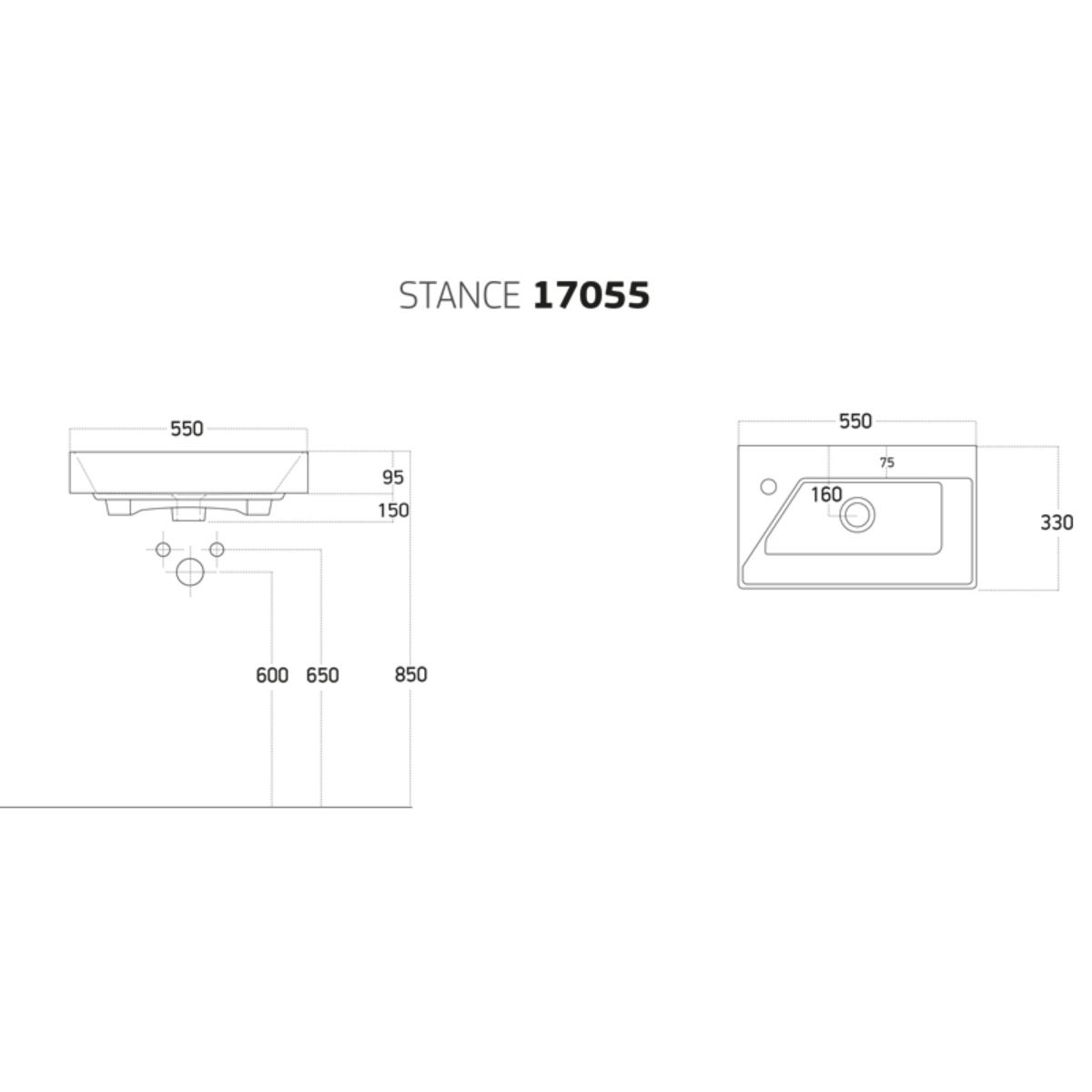 The Stance 550mm vanity basin in white is designed to fit vanity units (vanity not included), ideal for compact bathrooms and cloakrooms. Its clean, modern design combines practicality with style. Crafted from high-quality ceramic with a smooth, easy-clean finish, it offers durability and elegance. Featuring a single tap hole for monobloc taps. Tap and waste are not included.